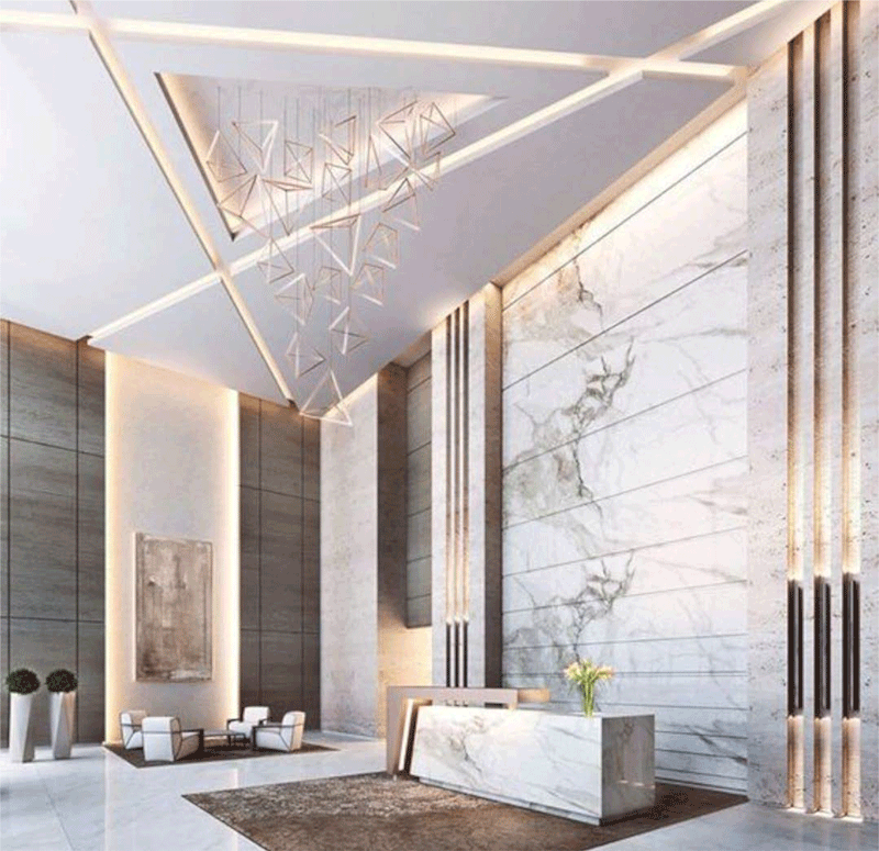 These yellow, indirect, ceiling lights provide a warm welcome to visitors outside elevators in the mall.
